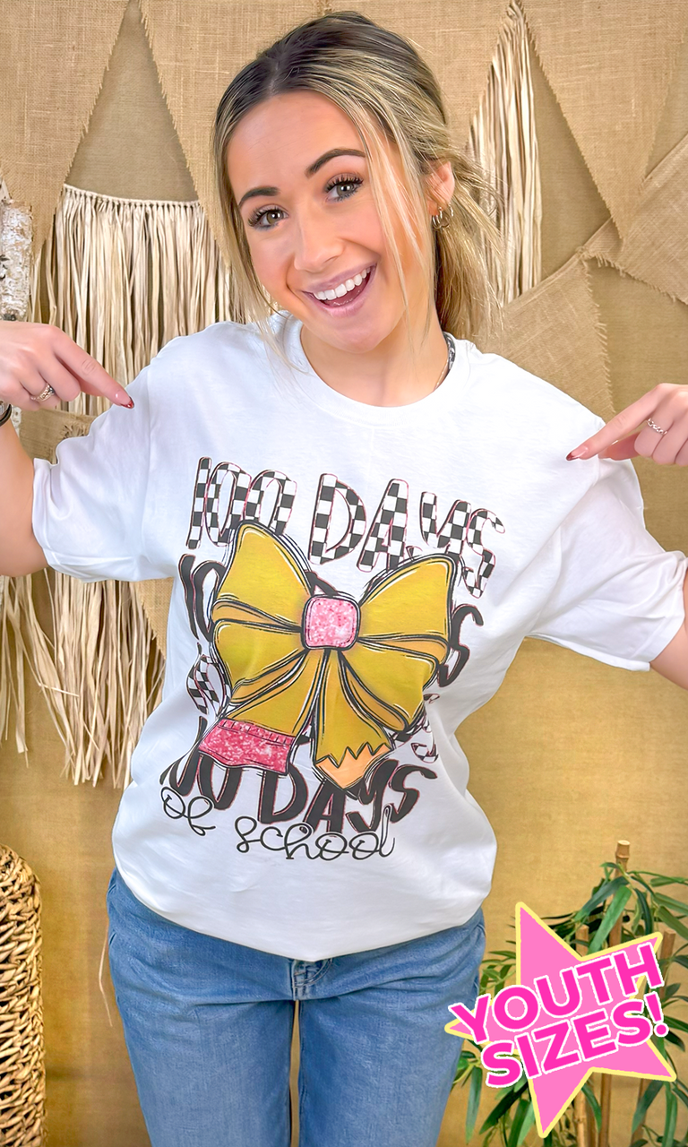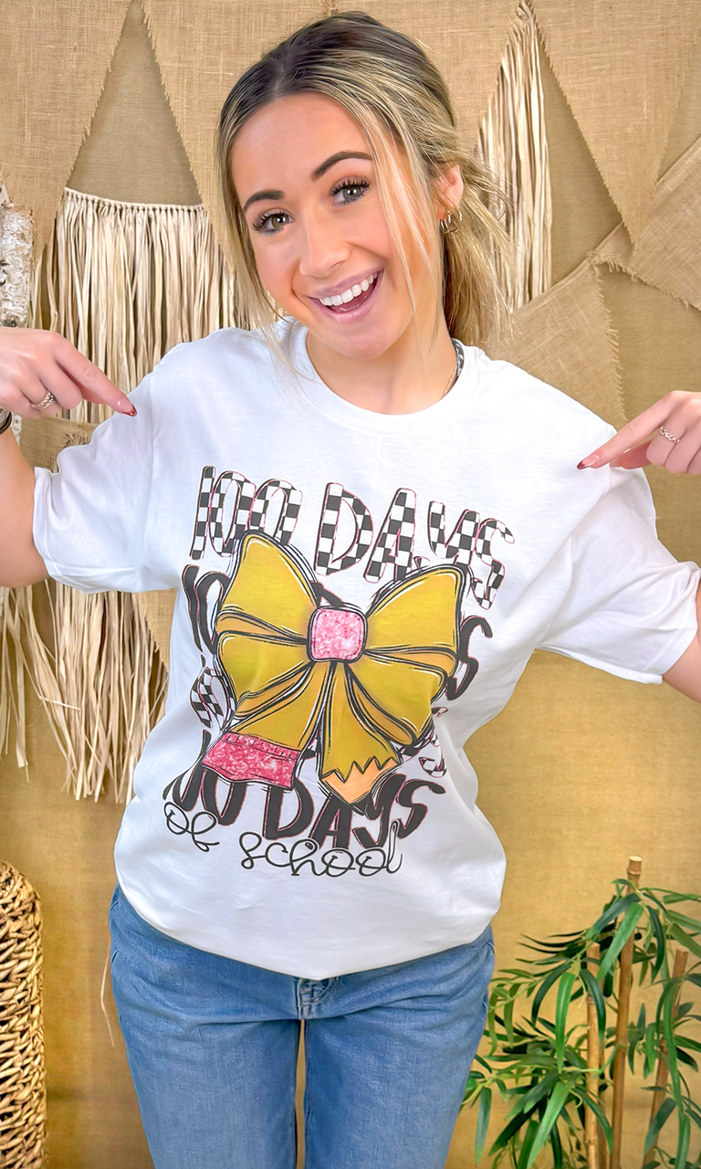 - This graphic t-shirt's design features a ribbon bow that resembles a yellow school pencil with a glittery pink eraser, with the words "100 DAYS of school." This top is perfect for celebrating the passing of one hundred school days!