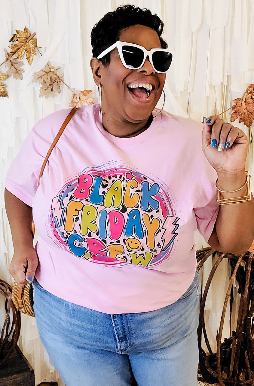 - Design features a retro font with black friday crew and lightning bolts and leopard watermark design.