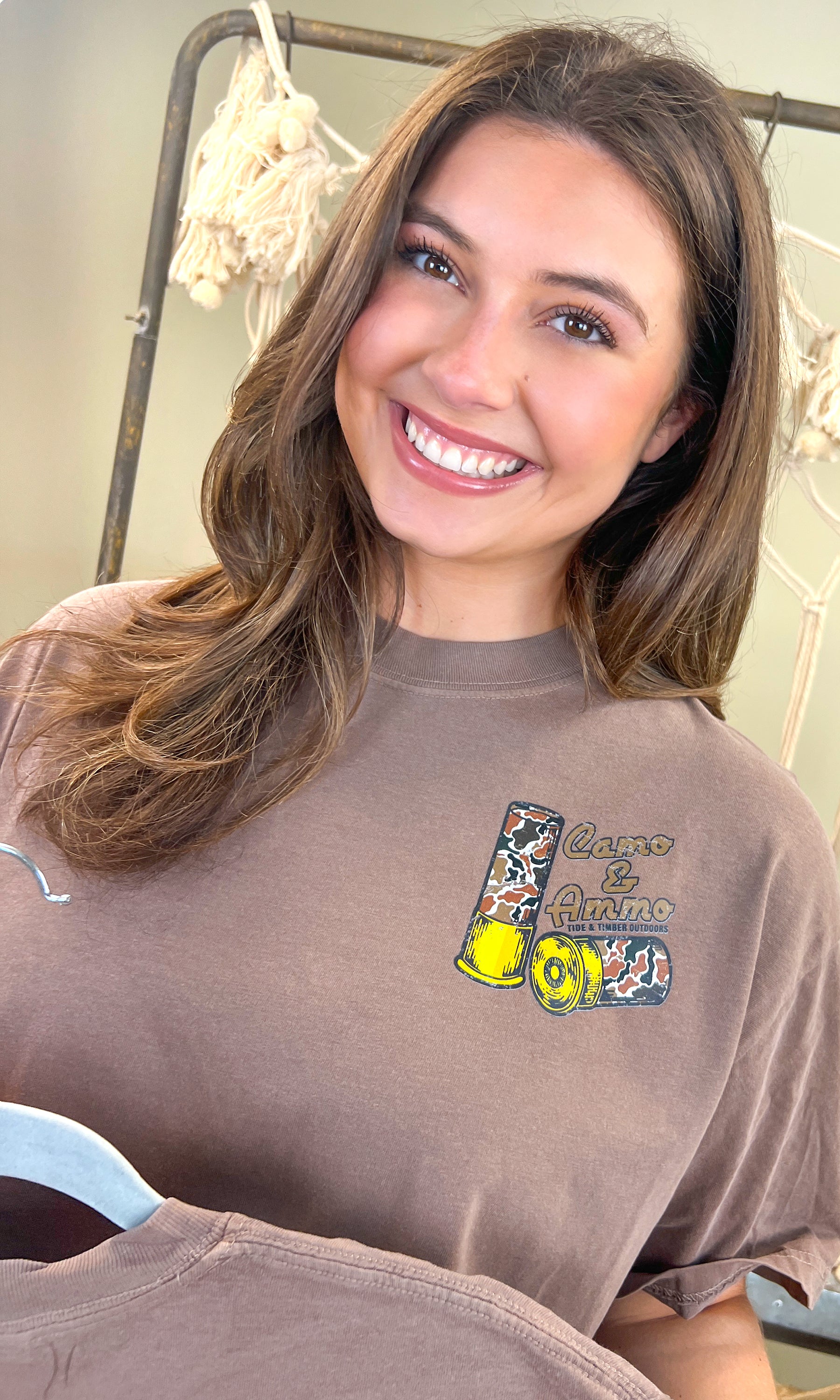 - The design of this graphic top features the words, "Camo & Ammo," and, "tide & timber outdoors," next two a couple of huge camouflaged shotgun shells. It's perfect for everyday wear!
