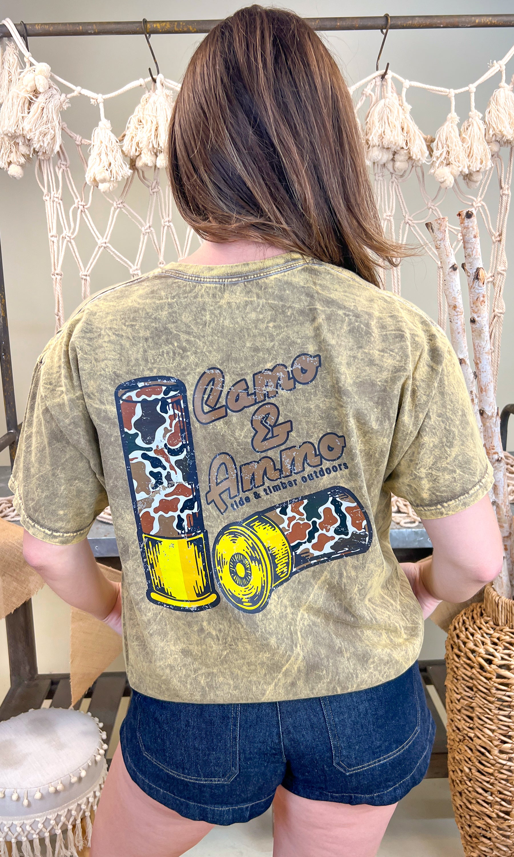 - The design of this graphic top features the words, "Camo & Ammo," and, "tide & timber outdoors," next two a couple of huge camouflaged shotgun shells. It's perfect for everyday wear!