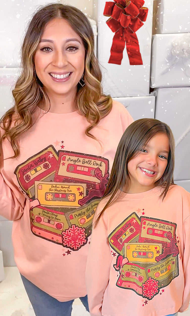 - Graphic long sleeve features a distressed design with several popular Christmas songs vintage cassette tapes. Along with a Santa hat, a snowflake, a reindeer and stars throughout the design. This trendy top is perfect for the Christmas season.