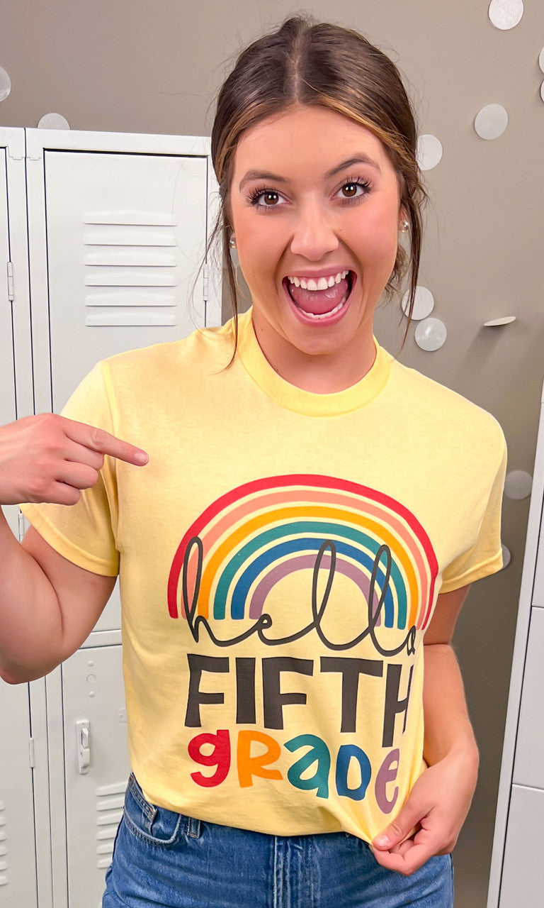- Graphic t-shirt design features a multicolored rainbow with your custom grade level underneath in a script font. This top is perfect for Teacher Appreciation Week.