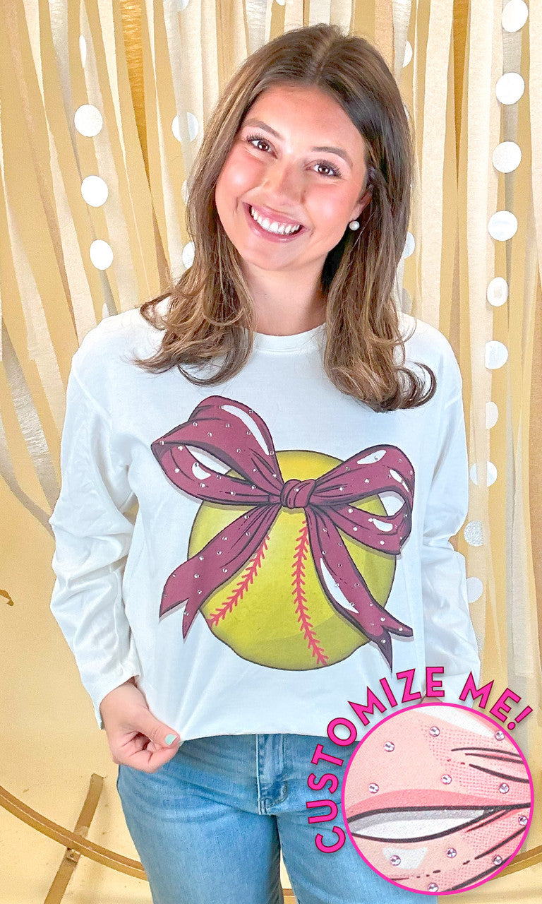 - This graphic boyfriend long sleeve shirt's customizable design features a softball with a big ribbon bow on top in your choice of color. Clear rhinestones are applied to the bow portion of the design. This top is perfect for softball season!