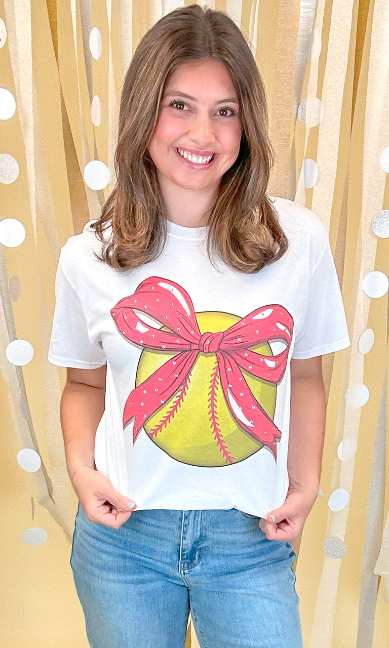 - This graphic t-shirt's customizable design features a softball with a big ribbon bow on top in your choice of color. Clear rhinestones are applied to the bow portion of the design. This top is perfect for softball season!