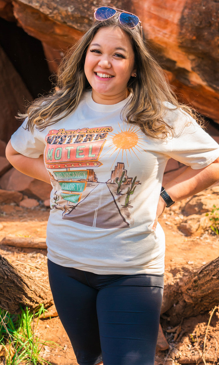 - Design features a classic western motel sign in front of a road with a desert scenery in the background.