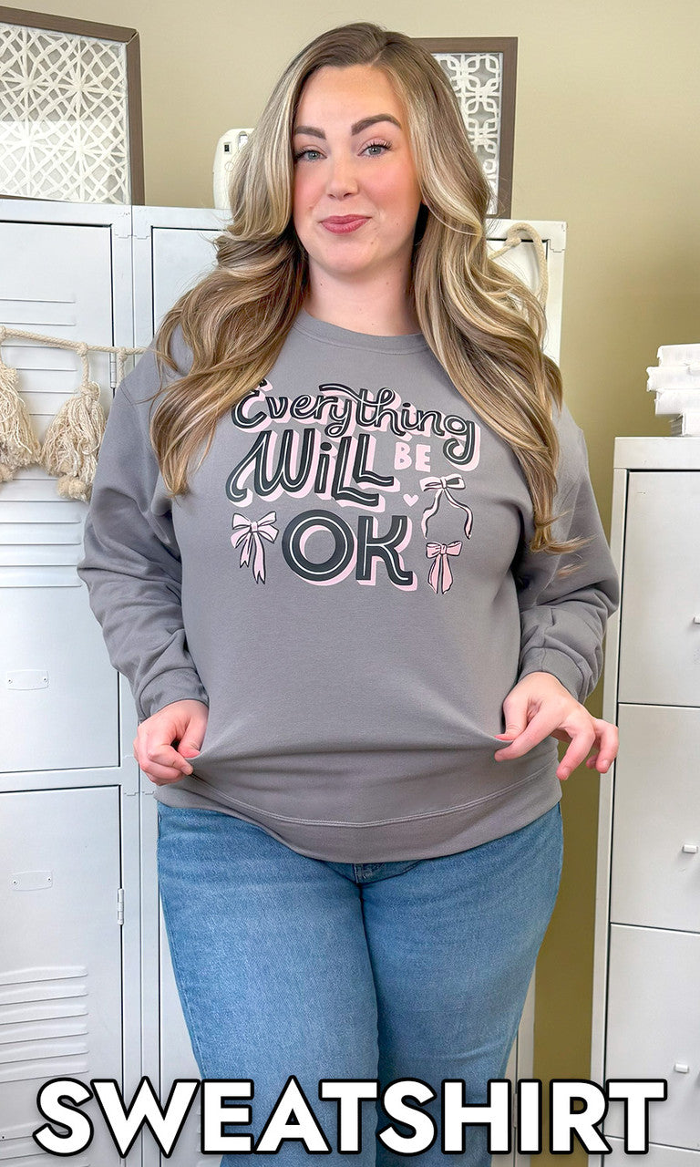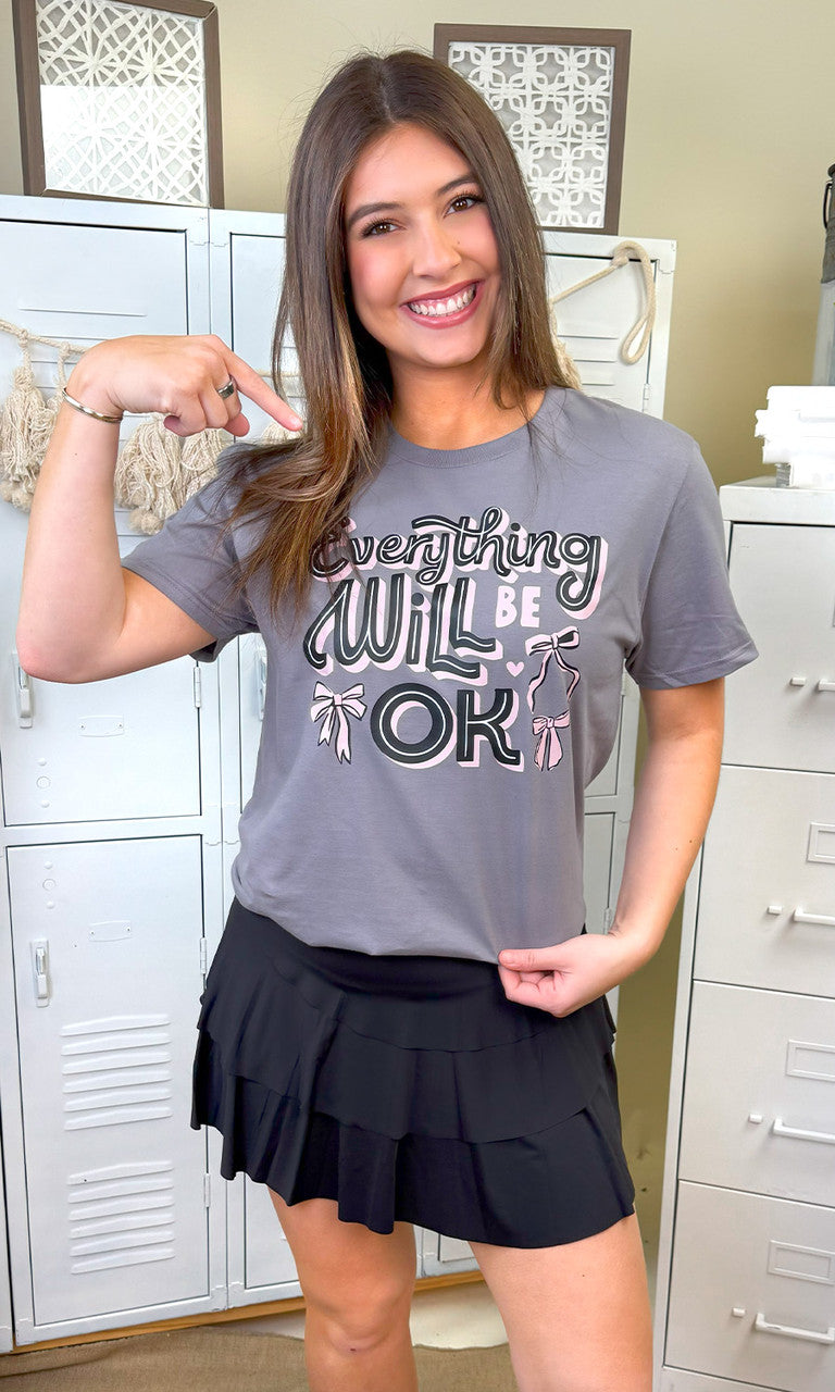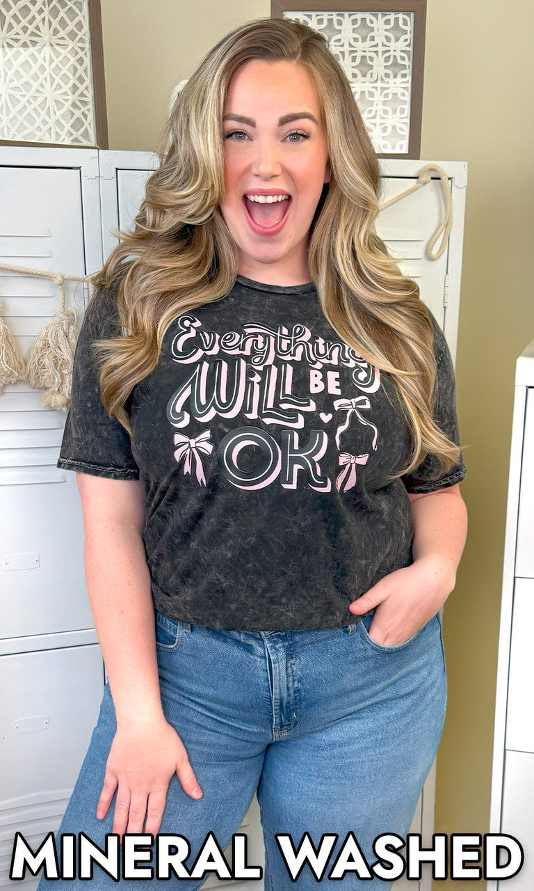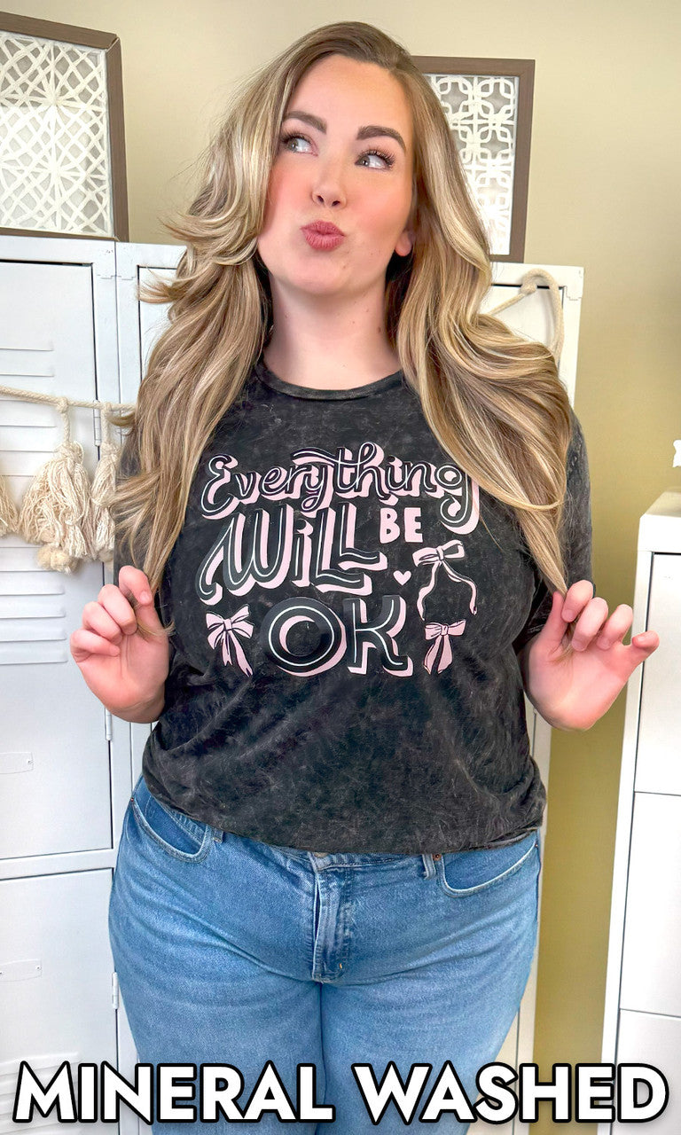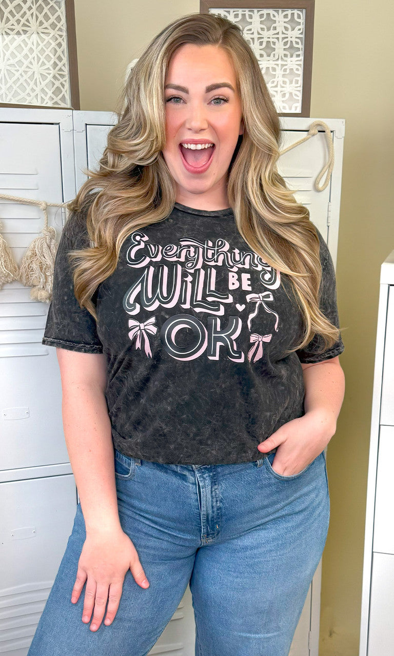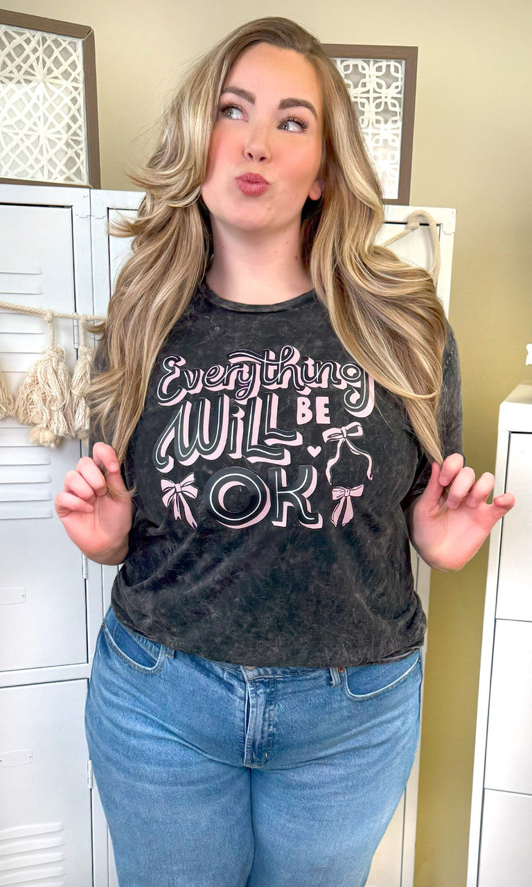 - The design of this graphic top features the words, "Everything Will Be Okay," with several pink ribbon bows interspersed. It is perfect for everyday wear!
