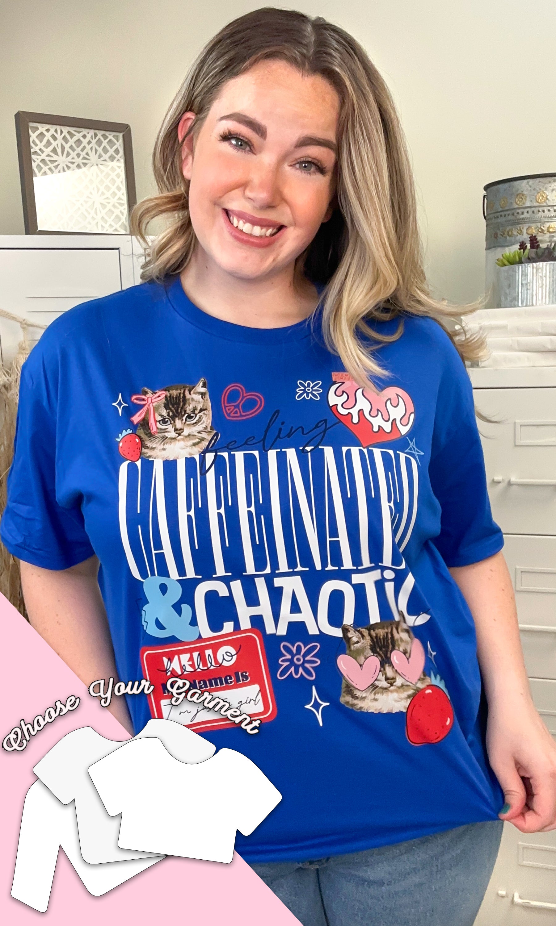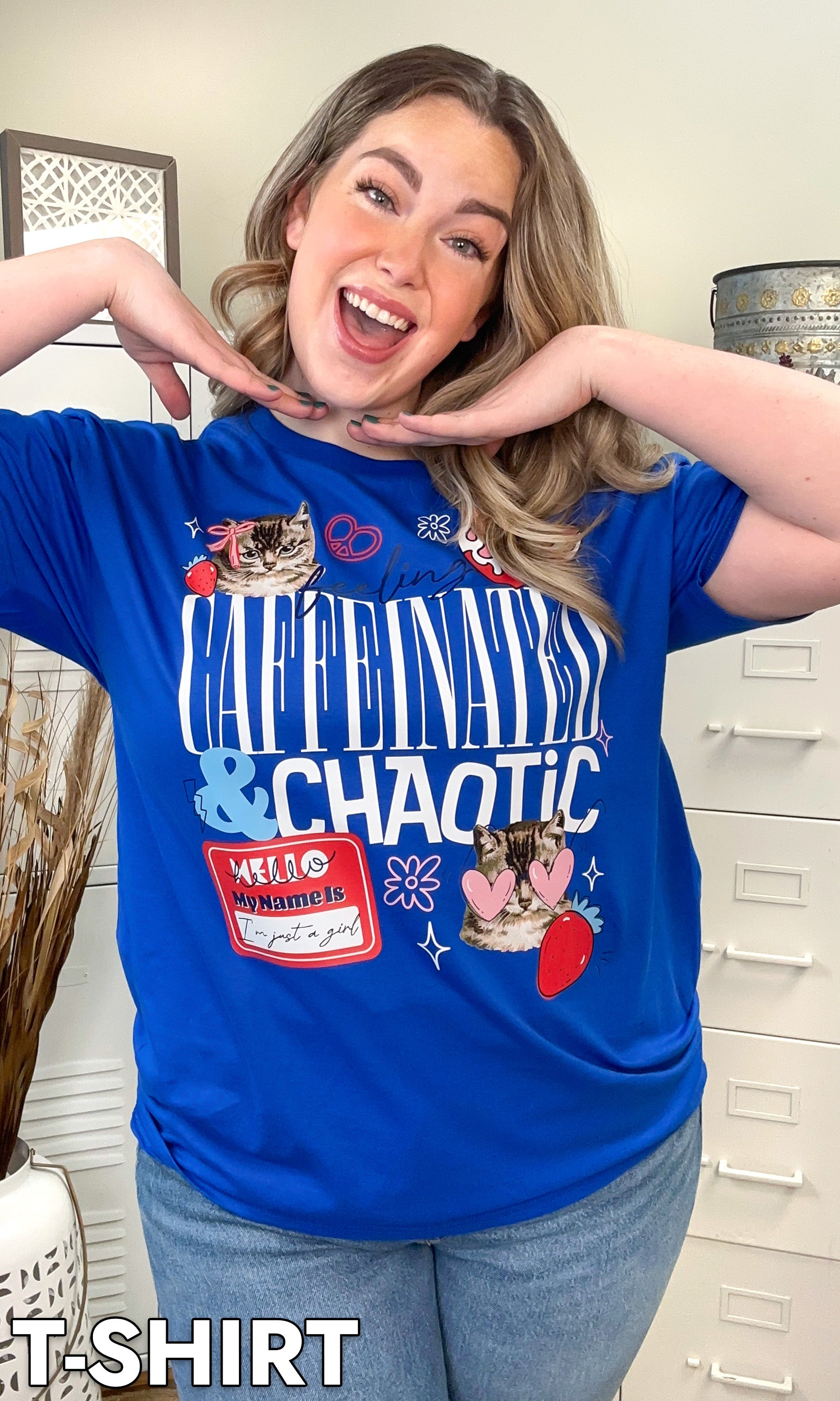 - The design of this graphic top features the words, "FEELING CAFFEINATED & CHAOTIC," as well as a scattering of various awesome and adorable shapes and images, such as kittens, heart, and a name tag with the text, "Hello My Name Is I'm Just A Girl," and much more. It is perfect for everyday wear!