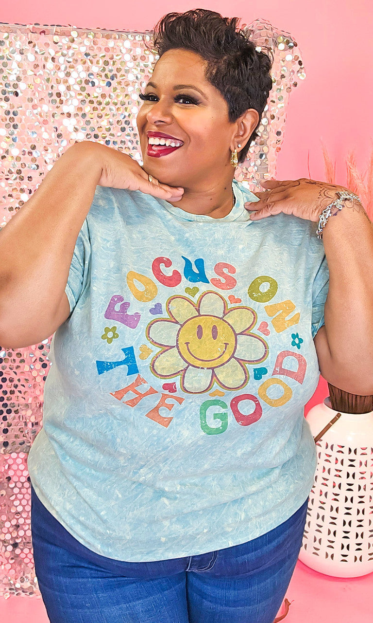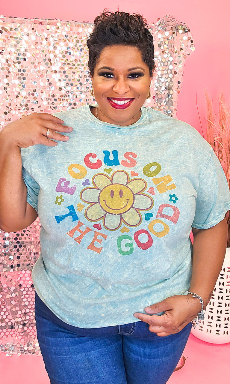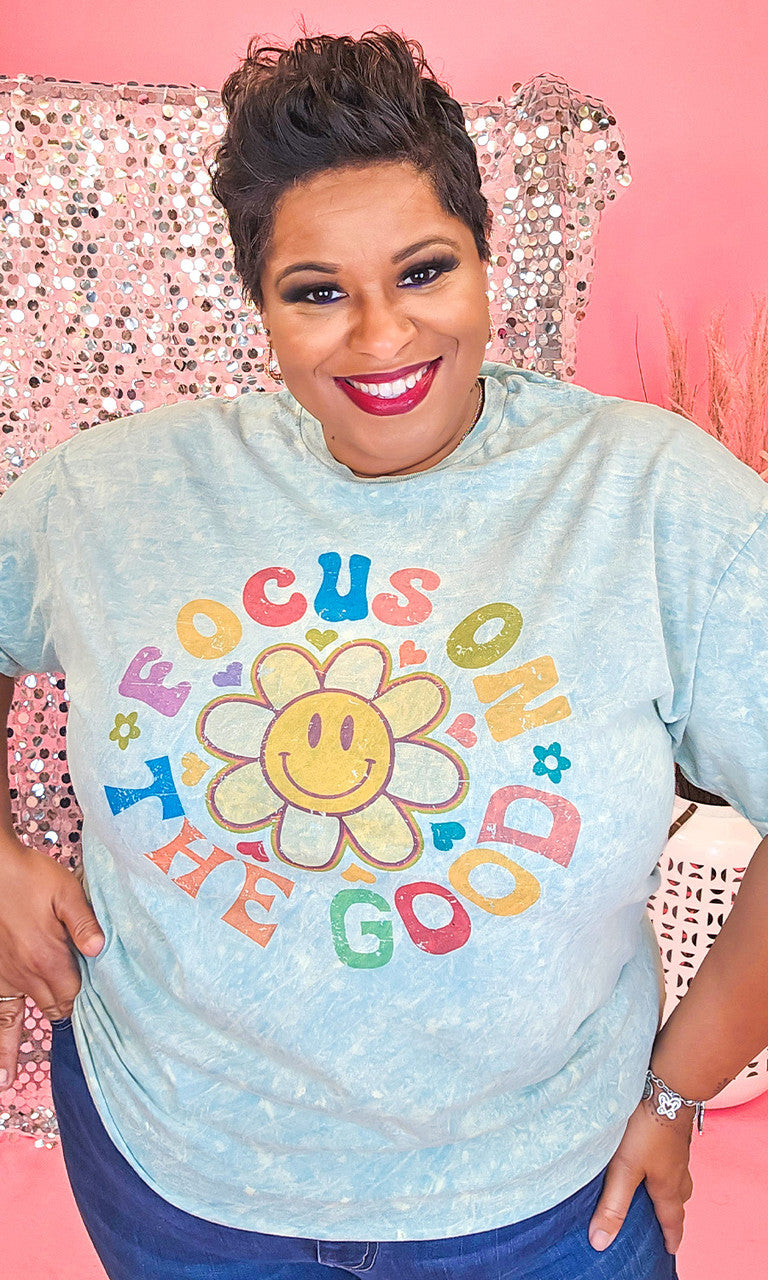 - This graphic t-shirt's design features the words, "FOCUS ON THE GOOD," in colorful, groovy, retro lettering. This top is perfect for everyday wear!