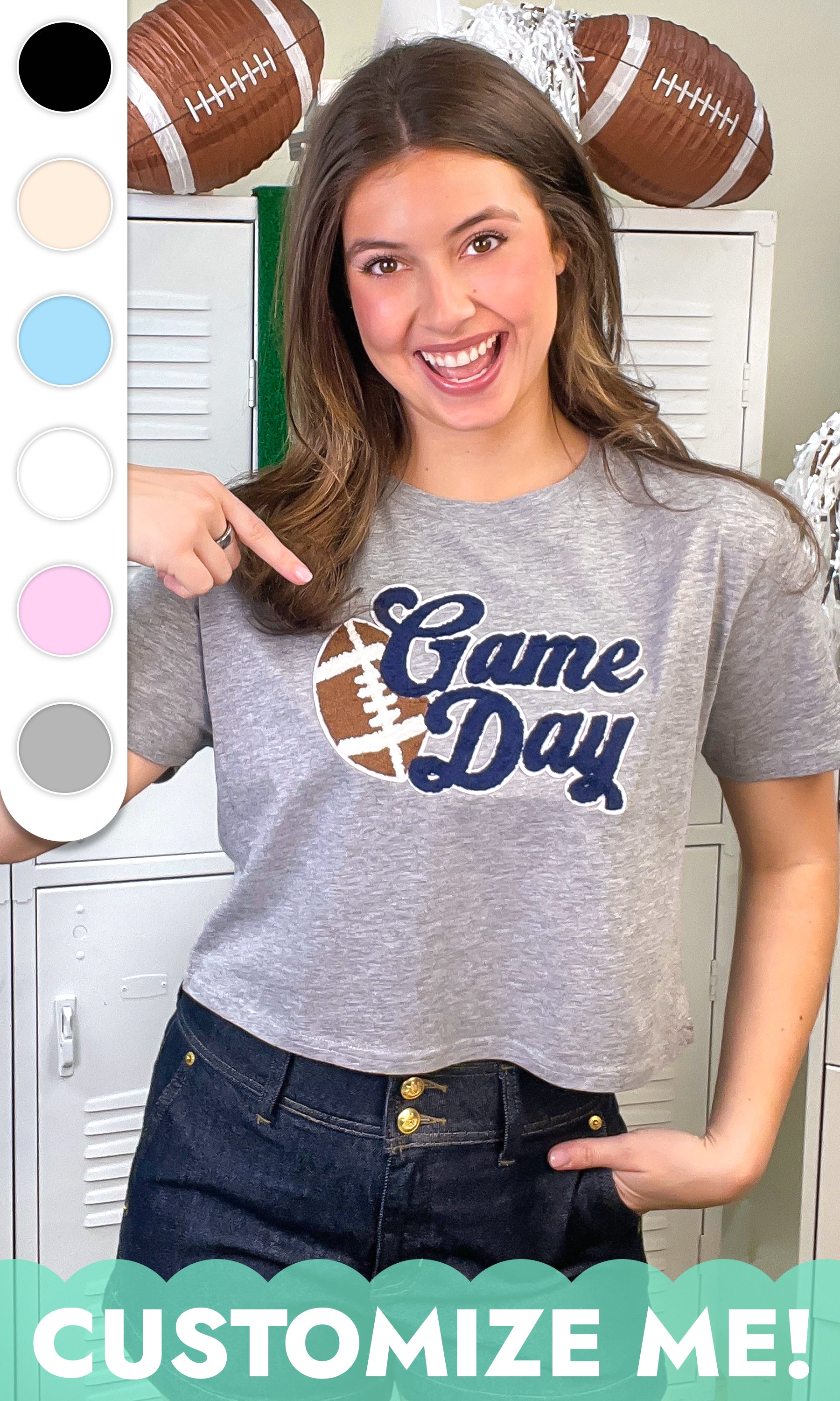 - The design of this chenille patch top features the words, "Game Day," in your choice of color, placed over a brown football. It's perfect for football game days!