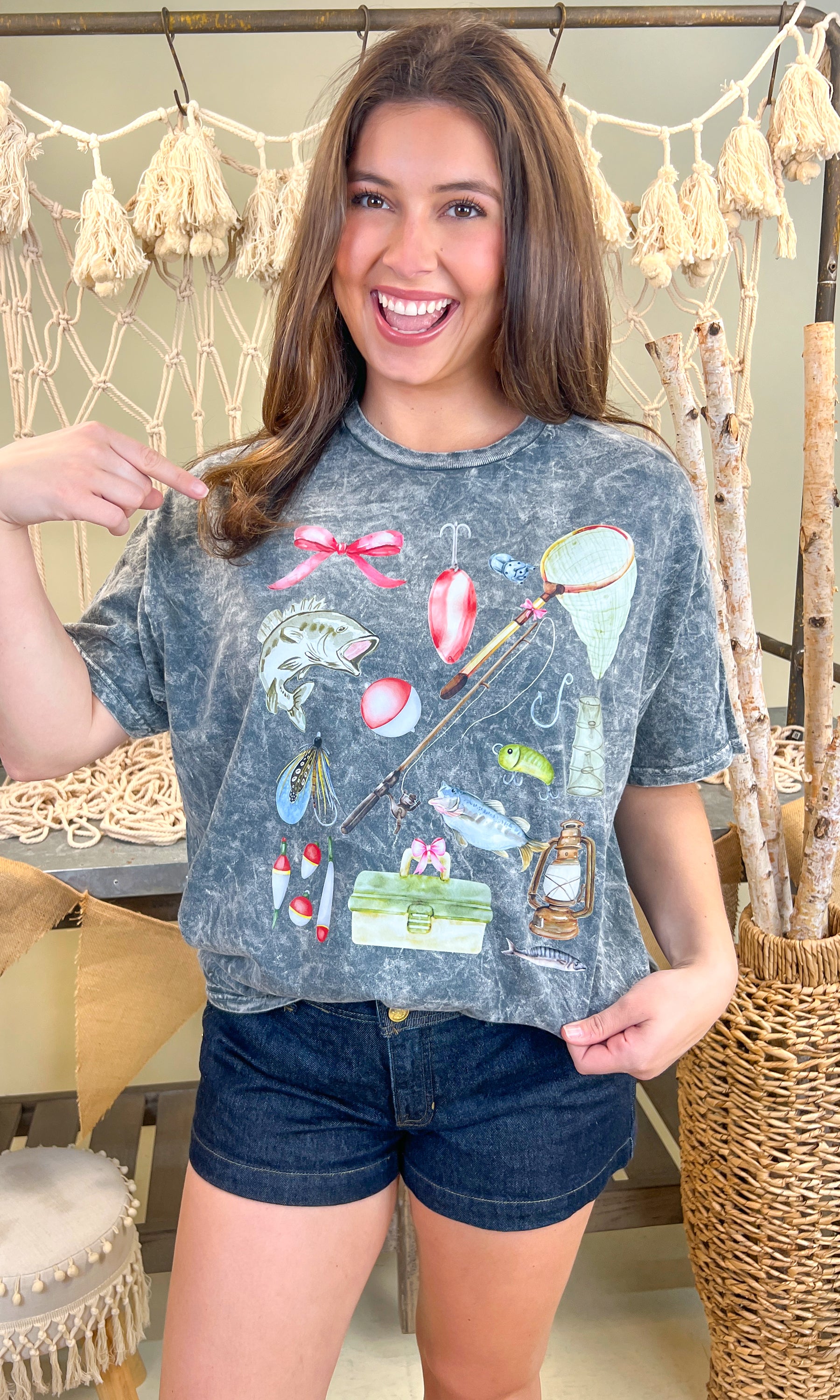 - The design of this graphic top features a collection of fishing supplies and fish, with a ribbon bow added. It's perfect for everyday wear!