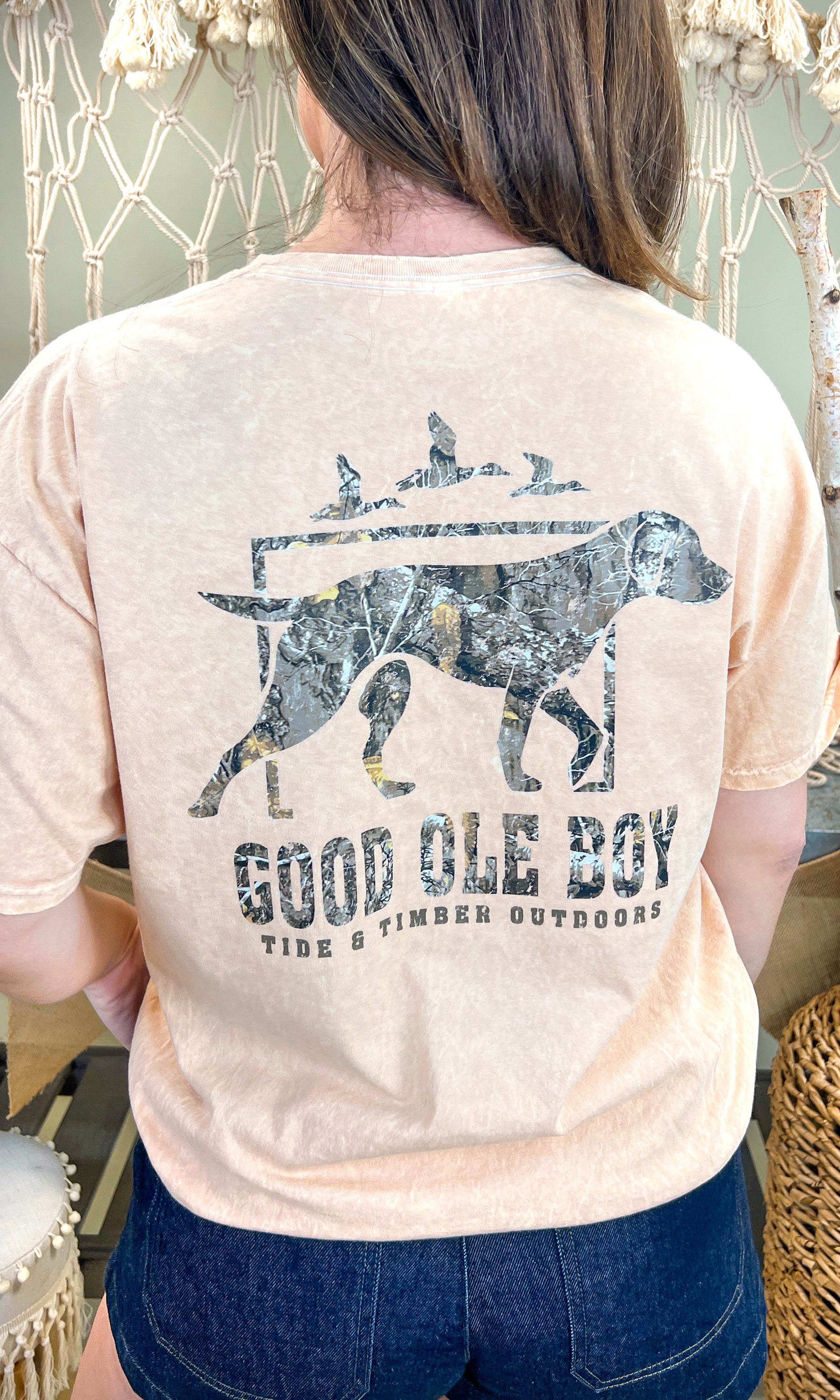 - The design of this two-sided graphic top features a silhouette of a hunting dog with three ducks flying above, along with the words, "GOOD OLE BOY," and "TIDE & TIMBER OUTDOORS," all in a camouflage pattern on the back, with the same dog repeated on the top left chest. It's perfect for everyday wear!