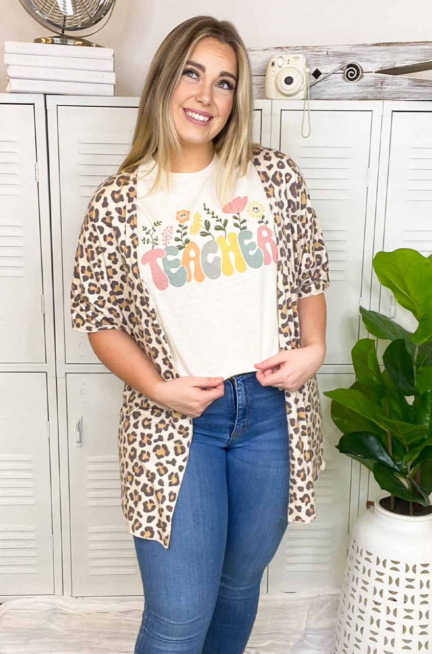 - Trendy: This tee has a spring/groovy vibe with the puff letters and floral accents; relaxed fit