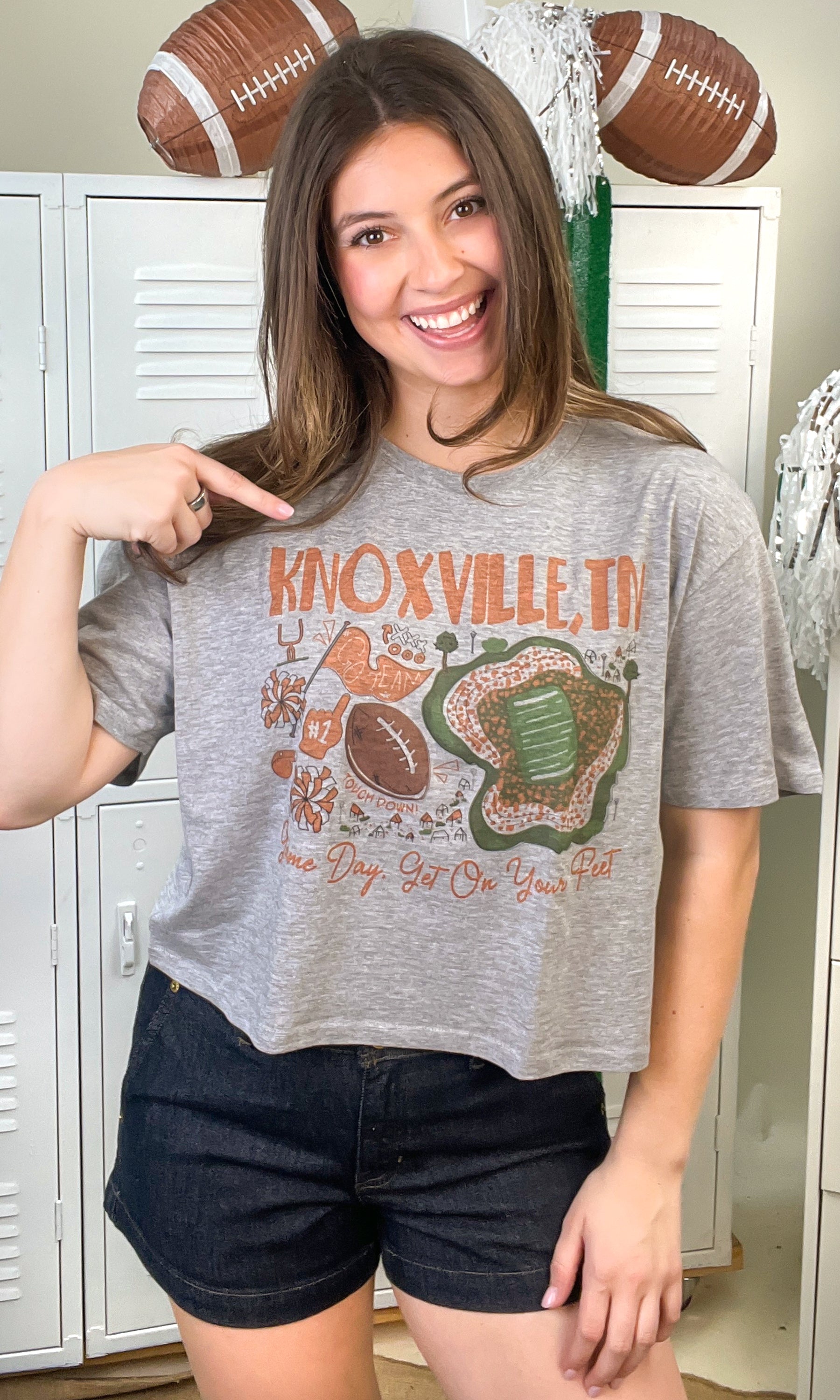 - The design of this graphic top features your custom text, including a location and a state, with your choice of primary and secondary coloration, on various images with a football game theme, like a stadium, a banner, a football, some cheerleader pom-poms, and much more. Below is written the words, "Game Day, Get On Your Feet." It's perfect for football game days!