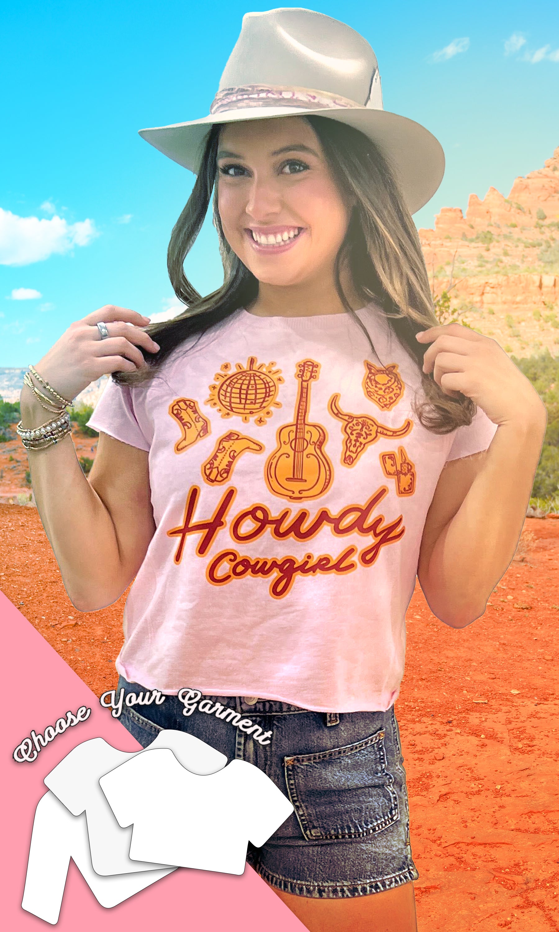 - The design of this graphic top features the words, "Howdy Cowgirl," written under a collection of fun objects with a country-western theme, such as boots, a cow skull, a guitar, a bandana, a lighter, and a sparkly disco ball. It is perfect for everyday wear!