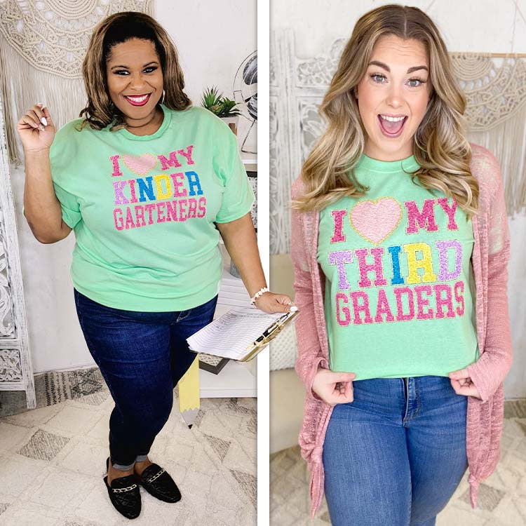 I Love My Grade Level Teacher T-Shirt for women with scoop neck and short sleeves; font has the appearance of patches