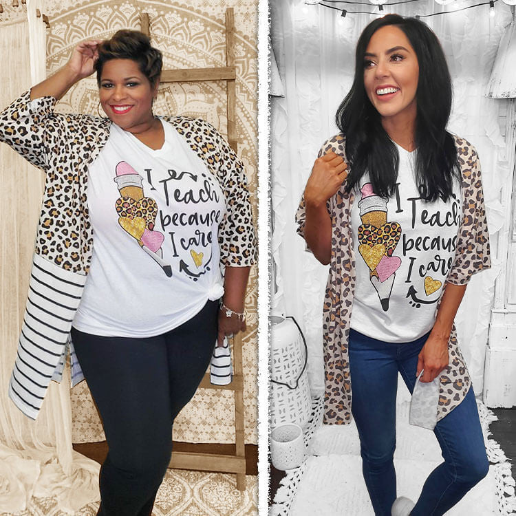 If you are a Teacher, we know you do it because you care. Sport this trendy design for a relaxed day at school. Pair it with any of our leopard cardigans for a layered look. We continually strive to bring you the lowest prices and best quality products available. Designed and shipped from out Texas Facility.