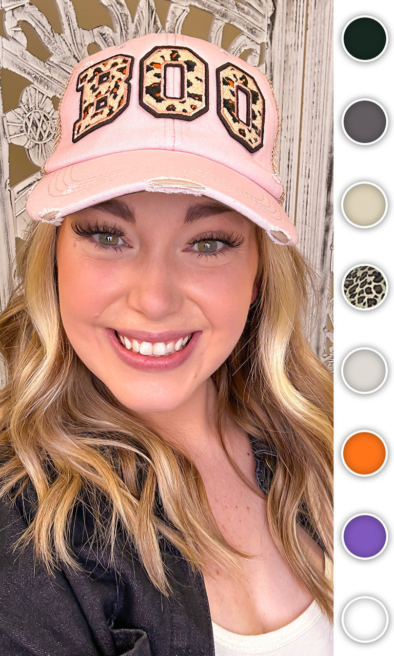 - Vintage hat features BOO in leopard letters, available in various hat colors.