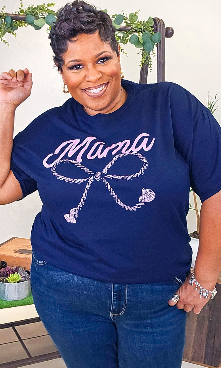 - This graphic t-shirt's design features the word "Mama" and a rope, tied in a bow, printed in pink. This top is perfect for any mama, whether at the rodeo or for everyday wear!