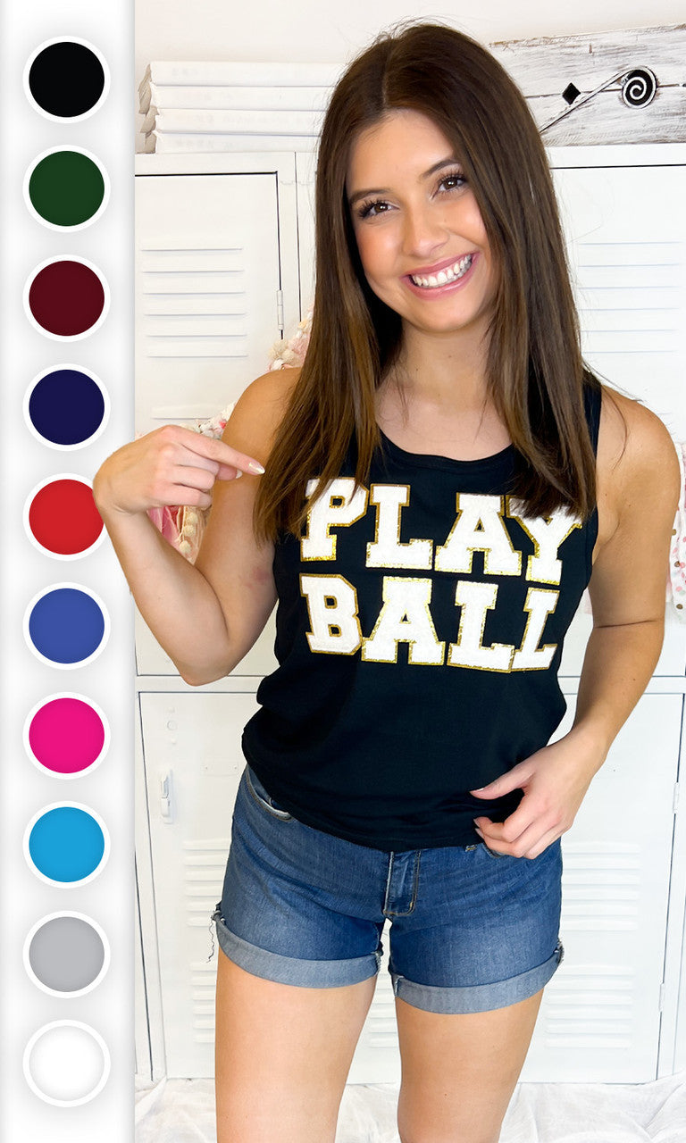 - Design features PLAY BALL in all white Chenille letters; available in 10 tank top colors.