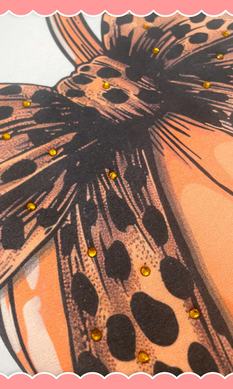 - Application: The graphic of this top is applied using a direct-to-garment (DTG) printing method. We then apply rhinestones on top of that.