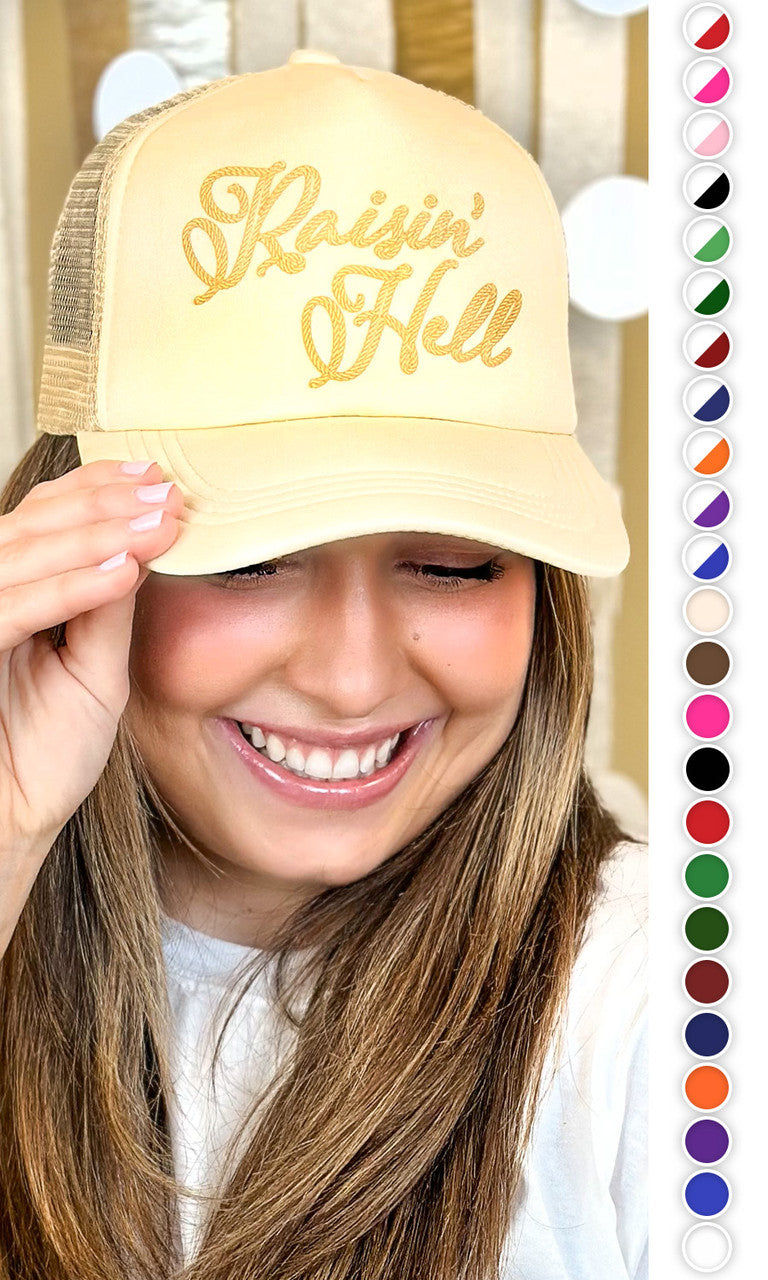 - This trucker hat's design features the words, "Raisin' Hell," in a cursive script that has the appearance of rope. This accessory is perfect for everyday wear!