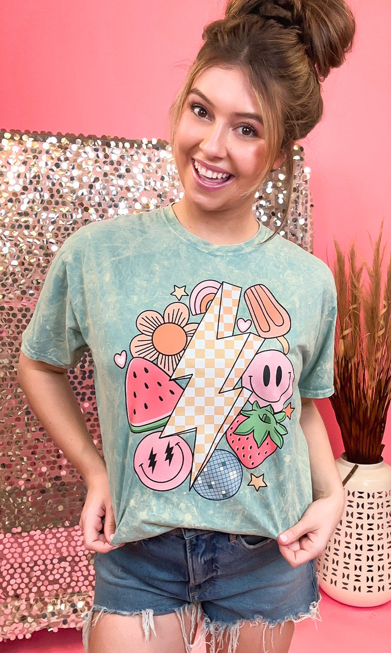 - This graphic t-shirt's design features a big yellow and white checkered lightning bolt, surrounded by fun objects like smileys, fruits, a popsicle, a flower, a disco ball, and more. This top is perfect for summertime!