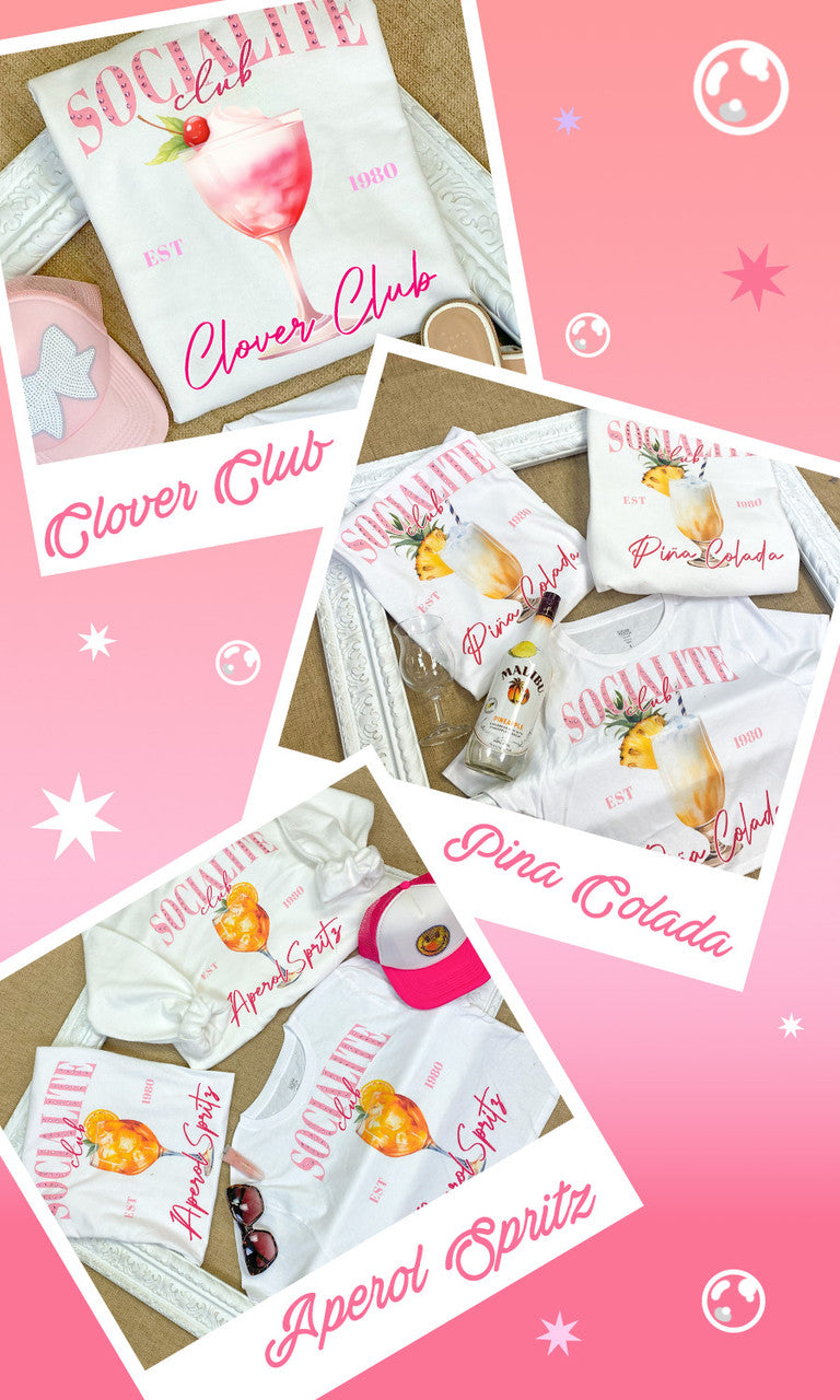 - This graphic sweatshirt's design features your custom choice of cocktail beverage. You name the cocktail, and we'll make a graphic for it with their names and the words, "SOCIALITE CLUB," and "EST 1980." Pink rhinestones will be applied to the "SOCIALITE" portion of the design. This top is perfect for everyday wear!