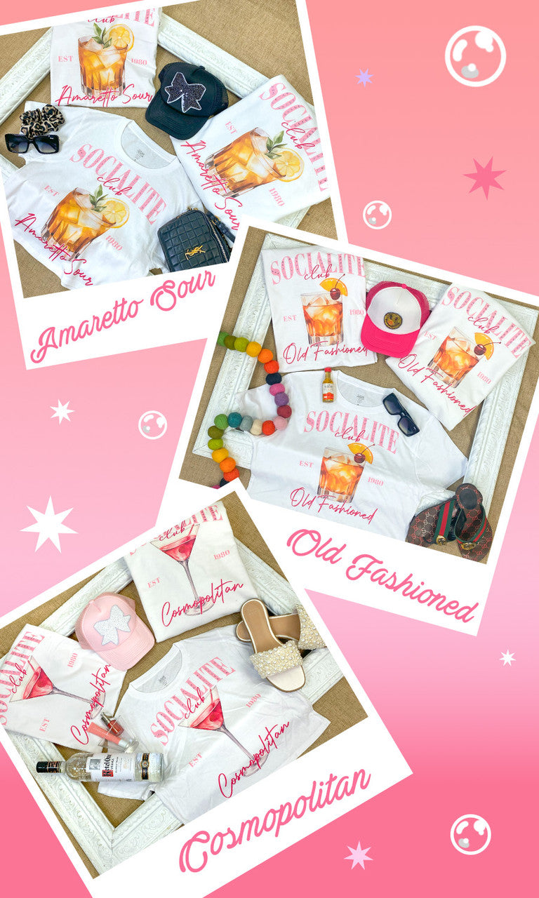 - This graphic t-shirt's design features your choice of sixteen different beautifully rendered cocktail drinks with their names and the words, "SOCIALITE CLUB," and "EST 1980." Pink rhinestones are applied to the "SOCIALITE" portion of the design. This top is perfect for everyday wear!