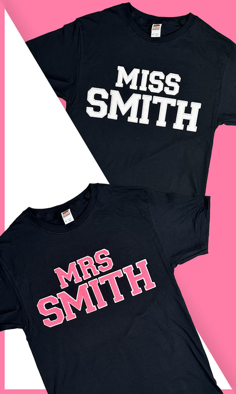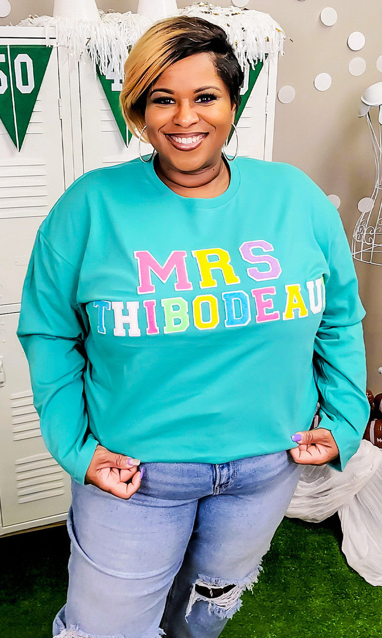 - Letter Patch Chenille long sleeve features a custom name in a mix of small & big letters stacked on to two lines. This trendy top is the perfect gift for back to school or Teacher Appreciation Week.