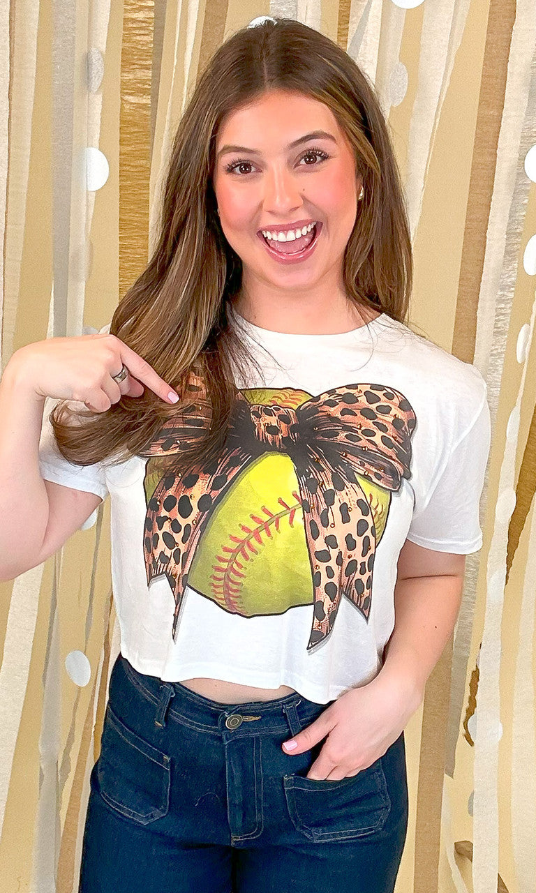 Product Title: Softball Cheetah Bow Rhinestone Graphic Crop Top Shirt