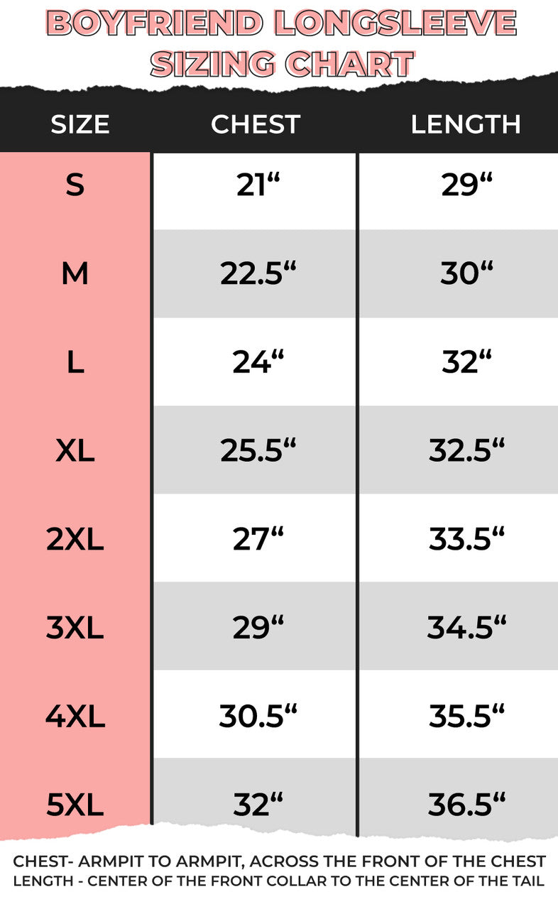- Sizing Hint: This is a boyfriend-cut long sleeve tee, which fits a bit oversized, so size down if you're in between sizes. See additional images for sizing charts.