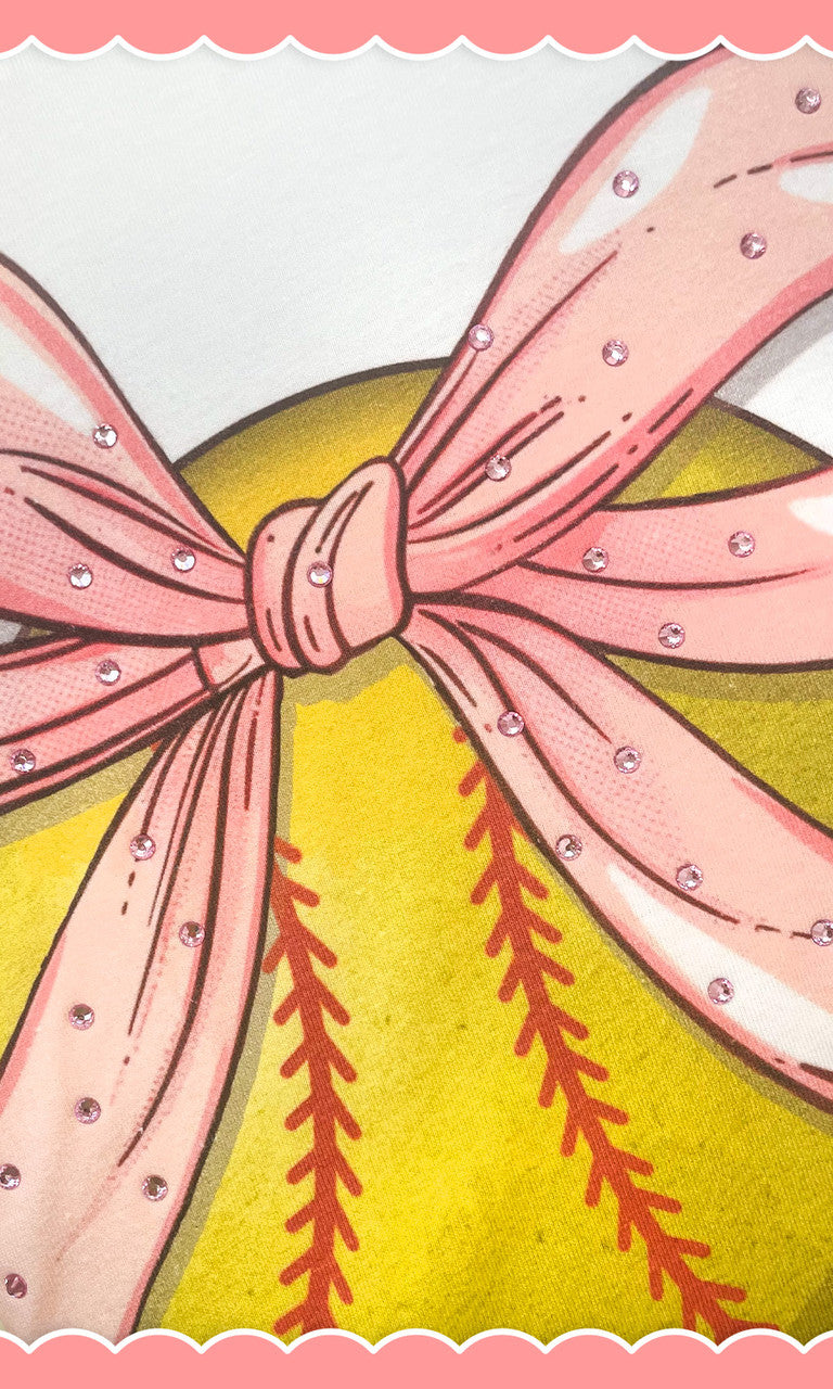 - This graphic t-shirt's design features an illustration of a softball with a big pink ribbon bow on top. Pink rhinestones are applied to the bow portion of the design. This top is perfect for softball season!