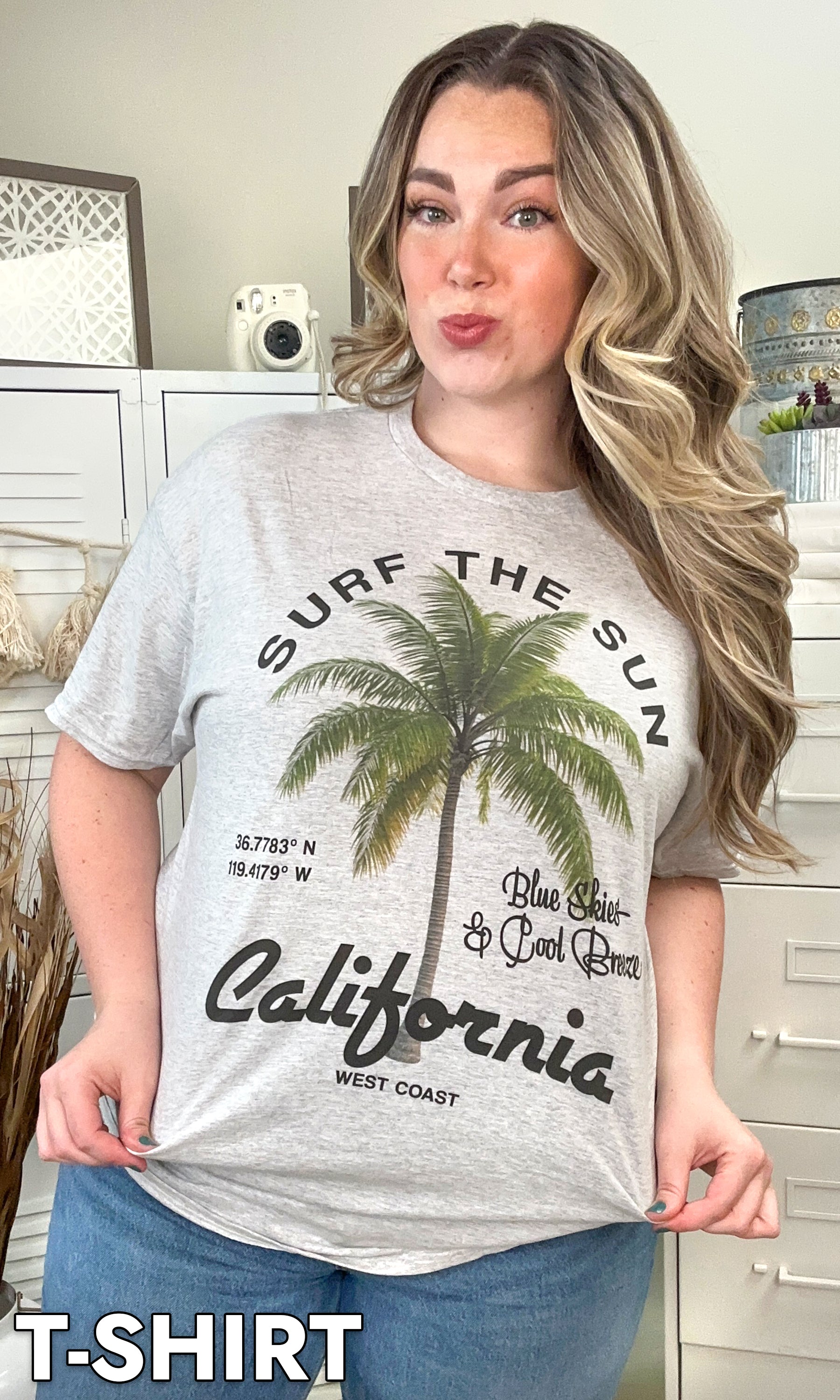 - The design of this graphic top features an image of a lush palm tree, accompanied by the words, "SURF THE SUN," "CALIFORNIA," "WEST COAST," and the phrase, "Blue Skies & Cool Breeze." It is perfect for summer season!