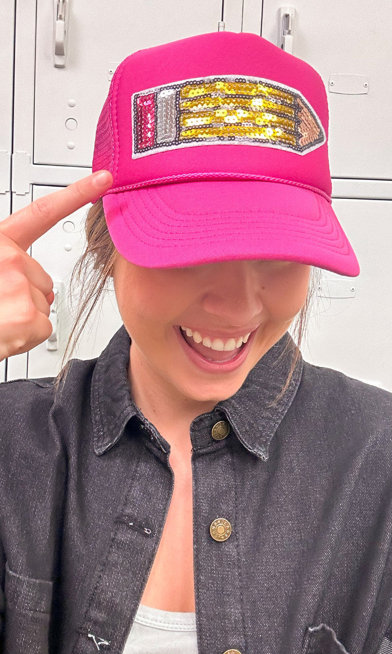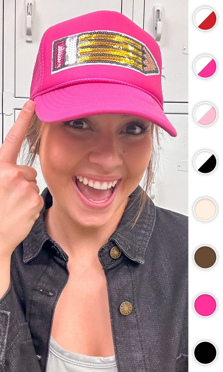 - Trucker hat features a sequin pencil in the middle of the hat. Available in a variety of hat colors.