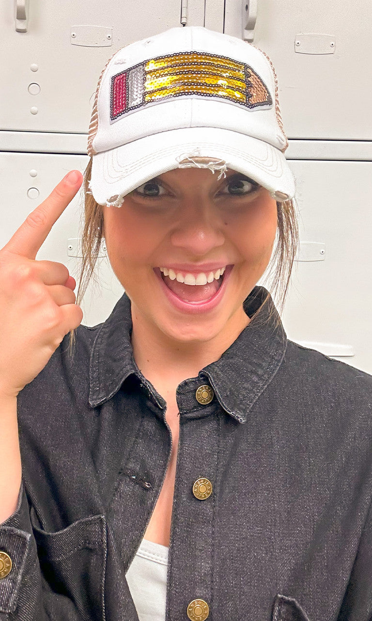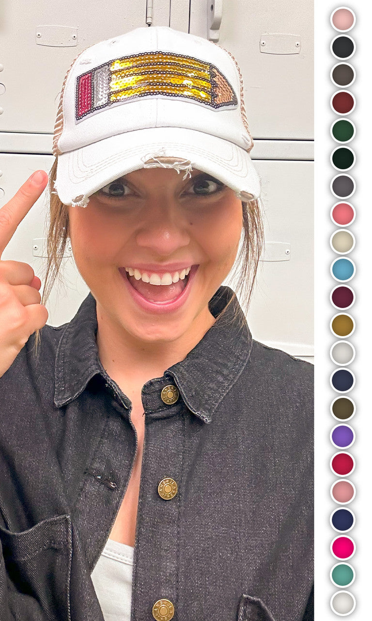 - Vintage hat features a sequin pencil in the middle of the hat. Available in a variety of hat colors.
