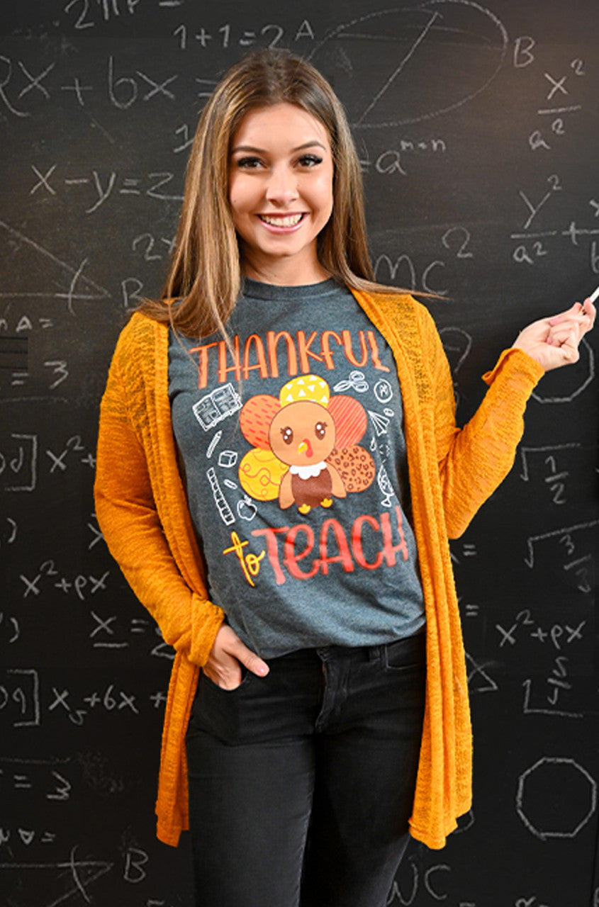 Show your students how thankful you are to teach them in this adorable tee. Pair it with any of our cardigans for a layered look. At Tees2urdoor.com™ we continually strive to bring you the lowest prices and best quality products available. A Tees2urdoor™ Original, designed & shipped from our facility in Texas...Y'all.