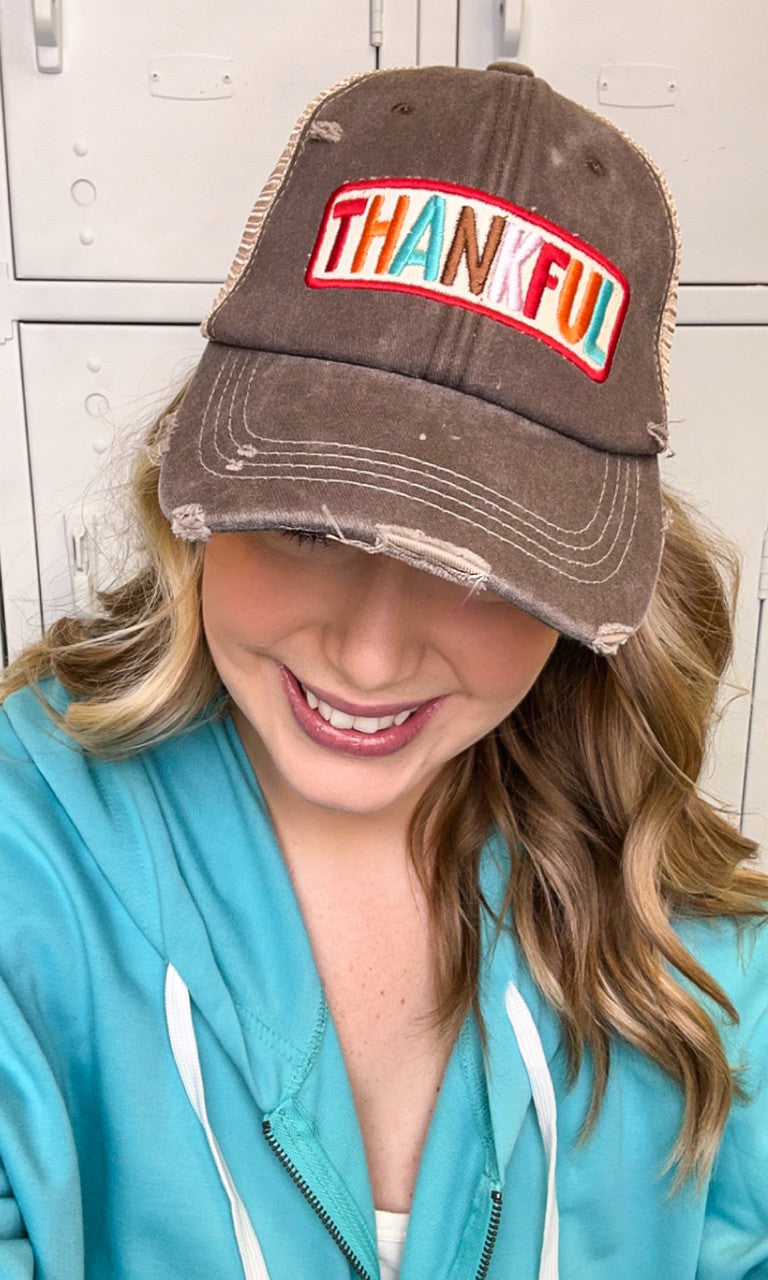 - Hat features a multicolored THANKFUL patch on a vintage brown hat.