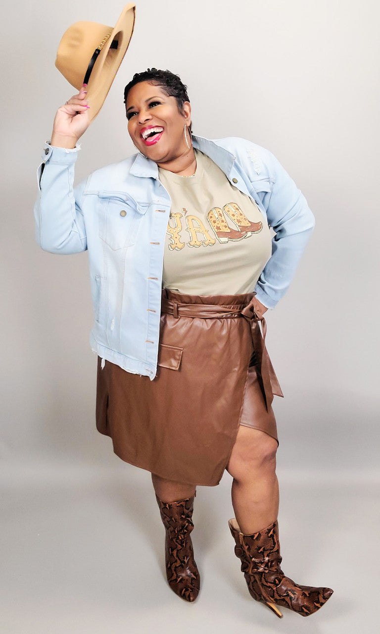 - Design features distressed Y'ALL with cowboy boots in place of the letters L. Printed in taupe, chocolate and brown with a white undertone.